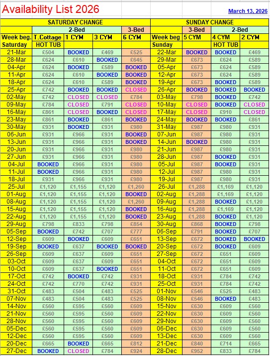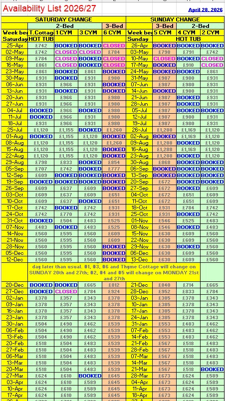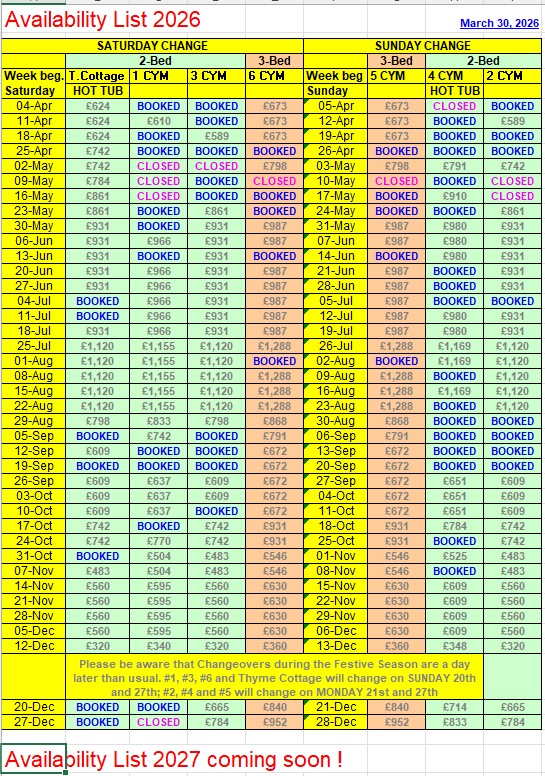 Welcome to my easy to read availability table. Here you can see at a glance which cottages are available for 12 months ahead as well as the relevant tariff. For tariffs and availability up to 2 years ahead, please enquire by email. Once you have made your selection, please reserve your choice of cottage, using the Search facility by clicking to go back to Coachyard Mews or Thyme Cottage, depending on your choice of location. Or, if you prefer, please get in touch using one of the methods below. |