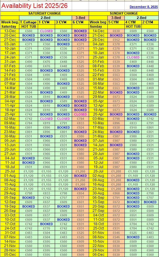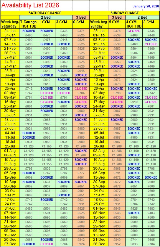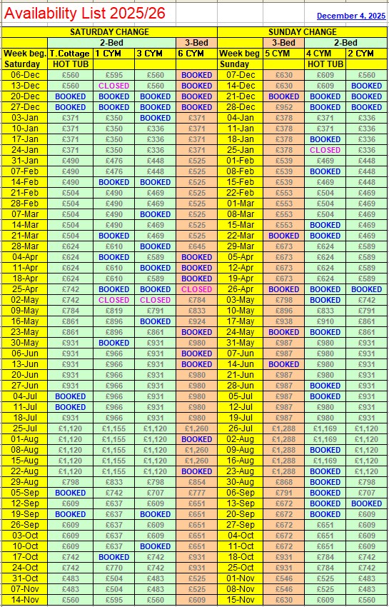 Welcome to my easy to read availability table. Here you can see at a glance which cottages are available for 12 months ahead as well as the relevant tariff. For tariffs and availability up to 2 years ahead, please enquire by email. Once you have made your selection, please reserve your choice of cottage, using the Search facility by clicking to go back to Coachyard Mews or Thyme Cottage, depending on your choice of location. Or, if you prefer, please get in touch using one of the methods below. |